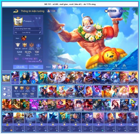 3 SKIN SS NGON , 1 ĐỐNG SKIN S+ HỮU HẠN , ........ ALL SKIN NHƯ HÌNH , SỐ TƯỚNG : 92 , SỐ TRANG PHỤC :129 ||| THÔNG TIN ACC : SỐ ĐỔI - MAIL GIAO - CCCD ( BẢO KÊ ALL ) ||| CẦN XEM FULL+ ẢNH NÉT ACC LIÊN HỆ MÌNH QUA ZALO : 0968201864 ||| ACC MÌNH BẢO KÊ ALL VĨNH VIỄN ||| MÌNH CÓ CỌC BÊN CEO LỰC 5M (Ở WED TOIUYTIN.COM AD SỐ 91) NÊN MỌI NGƯỜI YÊN TÂM GIAO DỊCH Ạ. CẦN BIẾT THÊM THÔNG TIN CHI TIẾT HAY THẮC MẮC GÌ IB MÌNH QUA ZALO: 0968201864.